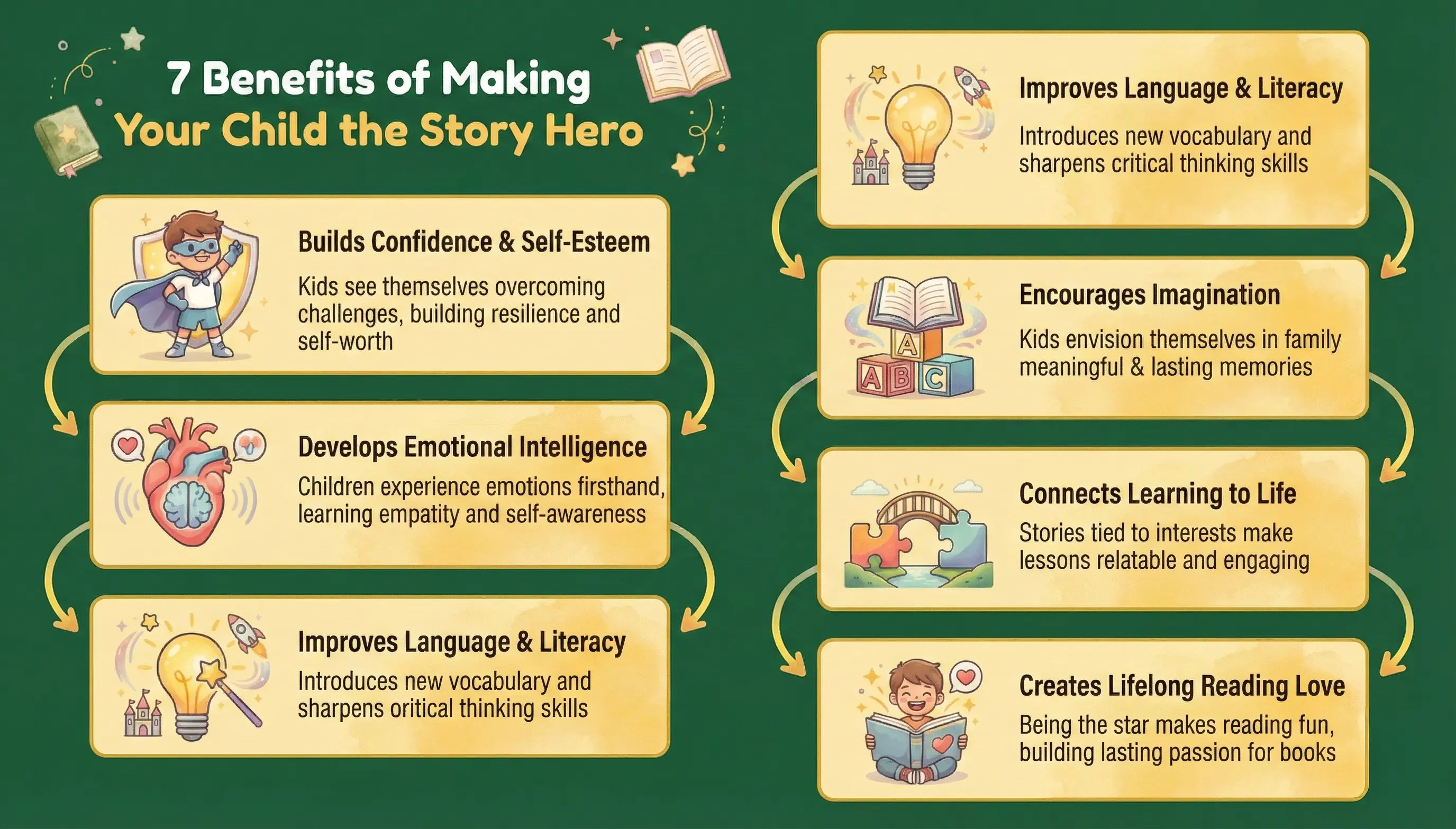 Personalized storytelling turns your child into the hero of their own adventures, helping them grow in ways that traditional stories can't. By weaving their name, traits, and interests into the narrative, you create a deeply engaging experience that strengthens their confidence, emotional understanding, and love for reading. Here’s a quick look at why this approach matters: