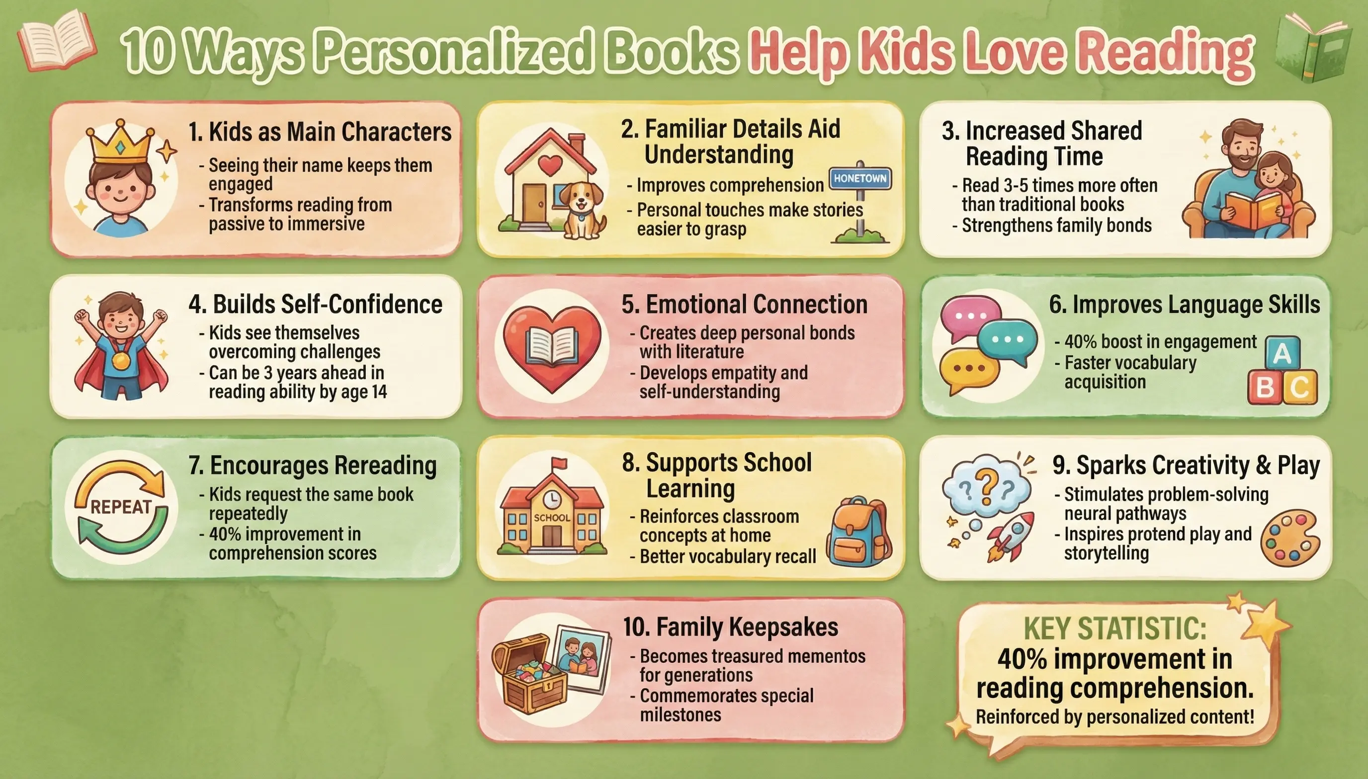 When kids see themselves as part of the story, it helps them pick up on details, expand their vocabulary, and internalize important lessons. This customized approach not only boosts comprehension but also creates a stronger emotional bond with the act of reading.