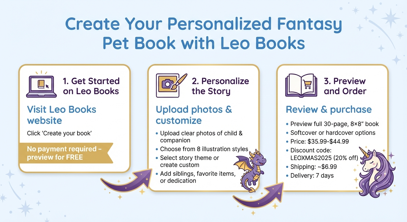 Ready to create your child’s fantasy pet adventure? Visit Leo Books, upload your photos, and watch everyday moments transform into cherished memories.